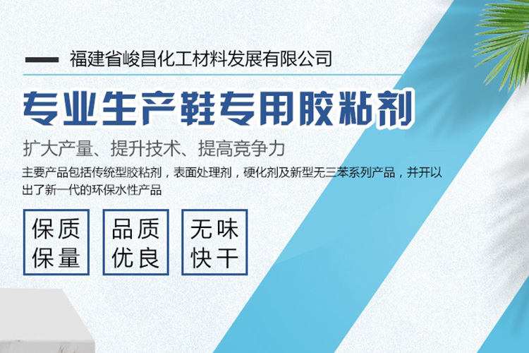 福建省峻昌化工材料發(fā)展有限公司總部設(shè)在中國鞋鄉(xiāng)——晉江。為更好、更方便服務(wù)廣大客戶,我司在廣東江門及福建均設(shè)有先進(jìn)的PU膠生產(chǎn)基地,歡迎廣大同行前來我司灌裝或批發(fā)銷售。公司是一家中外合資,面向亞太地區(qū)從事研究,生產(chǎn)銷售鞋用粘膠10多年的專業(yè)公司。從國外引進(jìn)生產(chǎn)能力為數(shù)萬噸的全套先進(jìn)生產(chǎn),檢驗(yàn)設(shè)備,與德國Bayer,日本DENKA及美國,西班牙等其它海外公司有著密切的原材料及技術(shù)合作。公司主要產(chǎn)品包括傳統(tǒng)型膠粘劑,表面處理劑,硬化劑及新型無三苯系列產(chǎn)品,并開以出了新一代的環(huán)保水性產(chǎn)品。供應(yīng)國內(nèi)外鞋業(yè),手提箱包及建筑工程單位使用。公司始終保持產(chǎn)品的良好品質(zhì)及專業(yè)特性,并倍受廣大客戶好評。